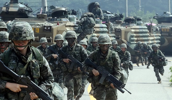 | 해병대 6여단 장병들이 적 침투상황을 가정해 훈련하며 상륙돌격장갑차에서 하차해 이동하고 있다.(사진=국방부) |