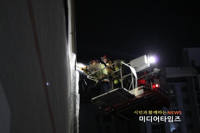 | 소방굴절차량 이용 고드름 안전제거(사진). <ⓒ미디어타임즈> |