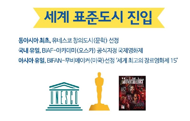 대한민국 표준을 넘어 세계표준 도시로 나아가기 위한 부천시의 노력이 유네스코 창의도시(문학) 지정, 공정무역도시(Fairtrade Town) 인증 등 다양한 결실을 맺었다. 부천국제애니메이션페스티벌은 국내 영화제 중 처음으로 아카데미 공식지정 국제영화제가 됐고 부천국제판타스틱영화제는 미국 무비메이커 선정 세계최고의 장르영화제에 이름을 올리기도 했다.