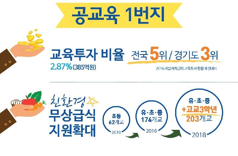 부천시는 백년지대계 공교육 혁신을 위해 다양한 시도를 해왔다. 친환경 무상급식 지원 확대, 고교 특성화 교육, 예술특화교육 아트밸리 등 학생들의 재능을 키울 수 있는 교육시스템을 만드는데 아낌없는 지원을 해왔으며, 정책수혜자들로부터 좋은 평가를 받고 있다.