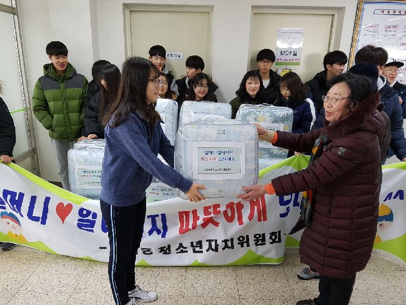 지난 5일에는 구래동 청소년자치위원회 청소년위원 15명이 관내 독거노인 25가구를 직접 방문해 이불 25채를 전달하는 행사를 가졌다.