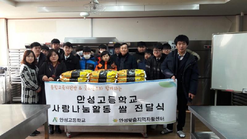 [미디어타임즈= 이옥수 기자] 안성고등학교(박한식 교장)은 연말연시를 맞이하여 이웃돕기 쌀을 안성맞춤지역자활센터(심상원 센터장)에 기증하는 ‘안성고등학교 사랑 나눔 활동 쌀 전달식’을 2018년 1월 5일 안성고등학교에서 가졌다.