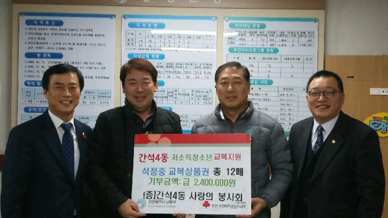 [미디어타임즈= 김광한 기자] 인천 남동구 간석4동(동장 황주헌)이 “간석4동 사랑의 봉사회”(회장 신문선)로부터 예비중학생 12명을 위한 240만원 상당의 교복티켓을 기증받았다.