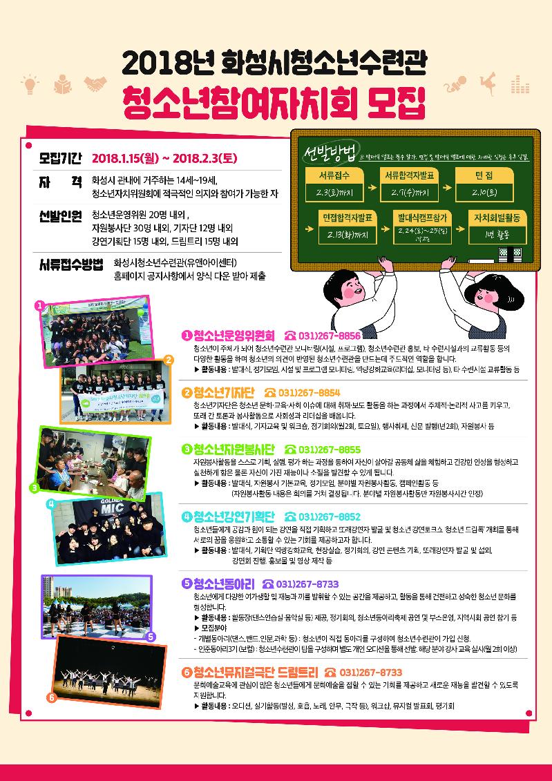 [미디어타임즈= 신훈종 기자] 화성시청소년수련관에서는 청소년들의 자발적인 참여활동을 통해 지역사회 발전에 기여하기 위해 ‘2018년 청소년참여자치회’를 모집한다고 밝혔다.