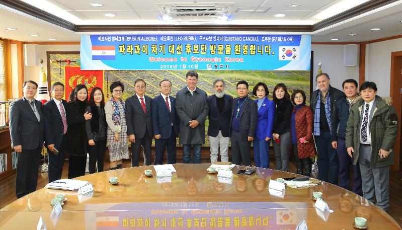 [미디어 타임즈 = 배수남 기자] 에프라인 알레그레(Efrain Alegre) 파라과이 대통령 후보 일행이 10일 경주시를 방문했다. 파라과이 건설부 장관과 상원의원을 역임한 에프라인 알레그레 급진정통자유당(PLRA, 파라과이 제1야당, 중도성향) 대통령후보는 2018년 4월에 치러지는 대통령선거에서 당선이 유력시되는 것으로 알려졌다. 남미에 위치한 파라과이는 브라질과 아르헨티나 투자 및 기술의존도가 아주 높은 곳으로, 이번에 경주를 찾은 파라과이 대통령 후보 일행은 새로운 기술과 기업 유치를 목적으로 아시아 시장 중 우선적으로 대한민국을 방문했다. 특히 ㈜성신오토텍과 미래의 먹거리인 전기자동차 기술 협약을 위하여 경주시를 직접 방문할 만큼, 자국의 경제발전과 개발을 위해 열정적인 노력을 기울이고 있다. 에프라인 알레그래 대통령 후보는 55세의 지도자로써 새로운 도시개발과 경제발전에 적극적으로 임하고 있고, 특히 세계의 중견국으로 도약한 한국의 경제발전에 많은 관심을 갖고 있다.