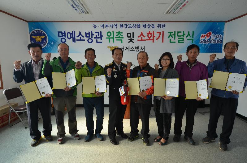 거제소방서(서장 윤종암)는 지난 28일 동부면 동산 마을회관에서 인근 마을이장 및 새마을 지도자 등 12명에게 소화기 지급과 함께 명예소방관으로 직접 위촉했다.