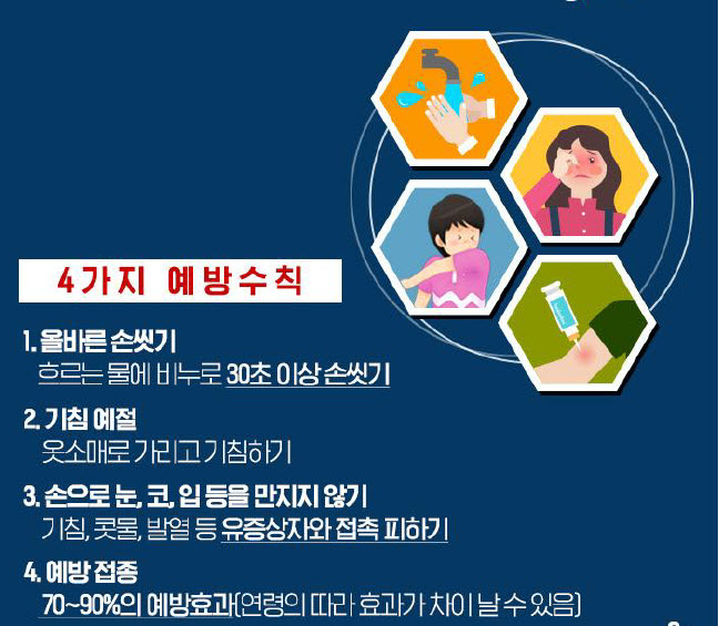 시 관계자는 “인플루엔자 예방 및 확산방지를 위해서는 무엇보다도 감염병 예방 기본 원칙인 30초 이상 손씻기와 기침예절 지키기 등 개인위생수칙을 실천해야 한다”고 강조했다.