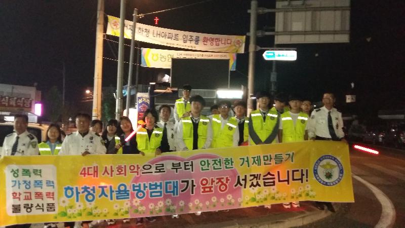 하청면자율방범대(방범대장 최귀복)와 거제시 청소년선도자율봉사단(학생단장 최우원) 30여 명과 함께 지난 21일(수) 저녁7시, 관내 초,중,고 학교주변 순찰 및 하청삼거리 일대에서 4대 사회악 근절 캠페인을 전개했다.