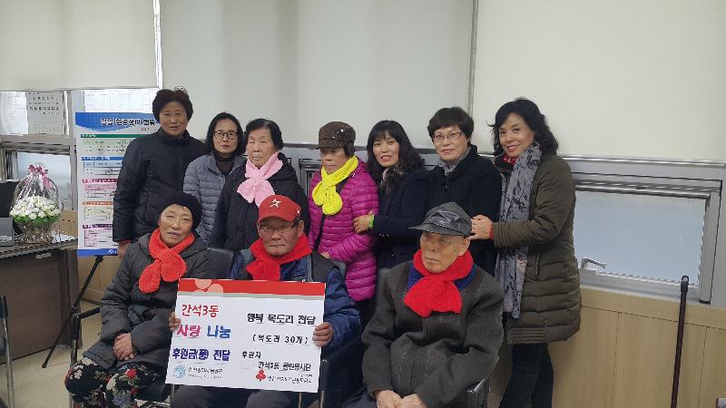 [미디어타임즈= 김광한 기자] 인천 남동구 간석3동(동장 심연숙)이 지난 10일 ‘행복 목도리’ 30개를 지역 저소득 노인들에게 전달했다.