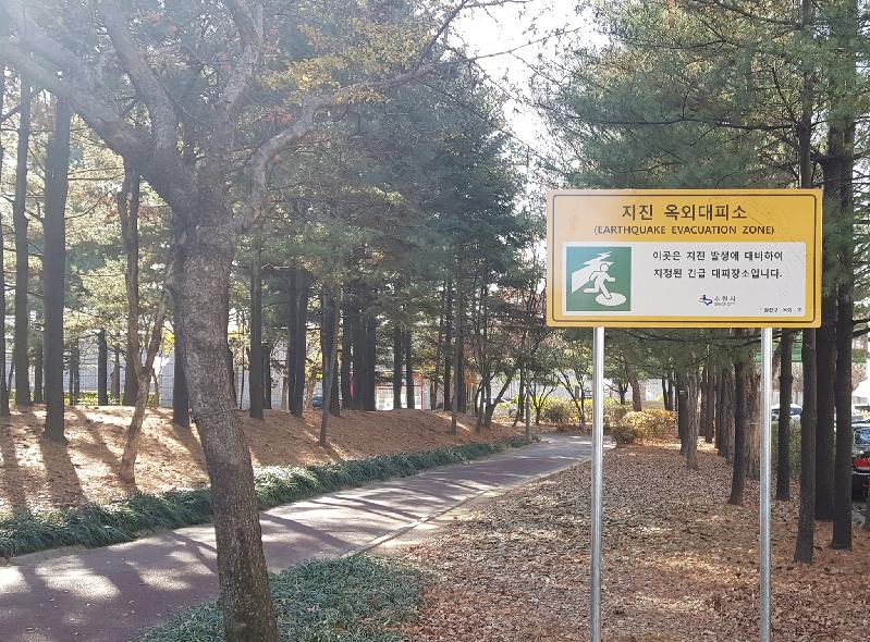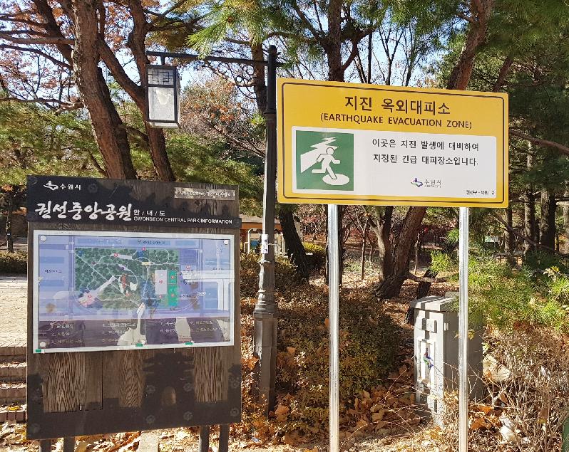 | 권선중앙공원에 설치된 지진 옥외대피소 안내표지판 사진. |