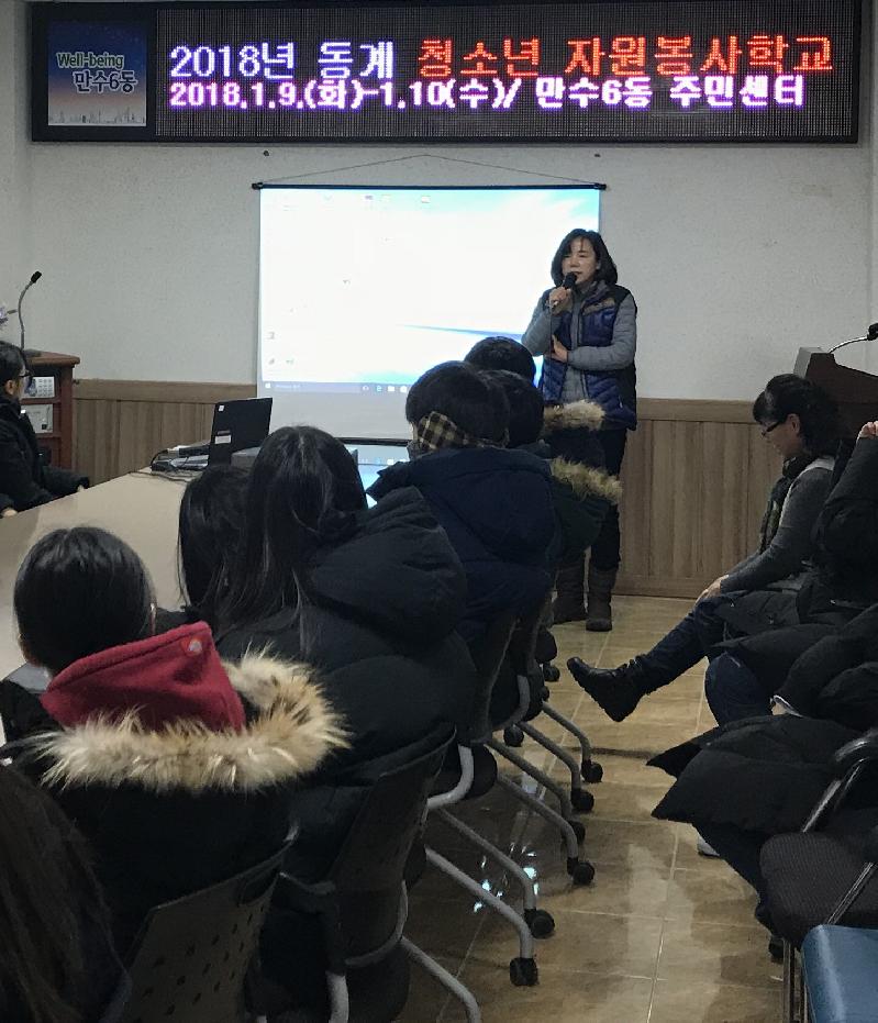 [미디어타임즈= 김광한 기자] 인천 남동구 만수6동(동장 안연숙)이 지난 9일, 10일 이틀에 걸쳐 청소년 50명이 참여한 가운데 겨울방학 자원봉사 학교를 운영했다.