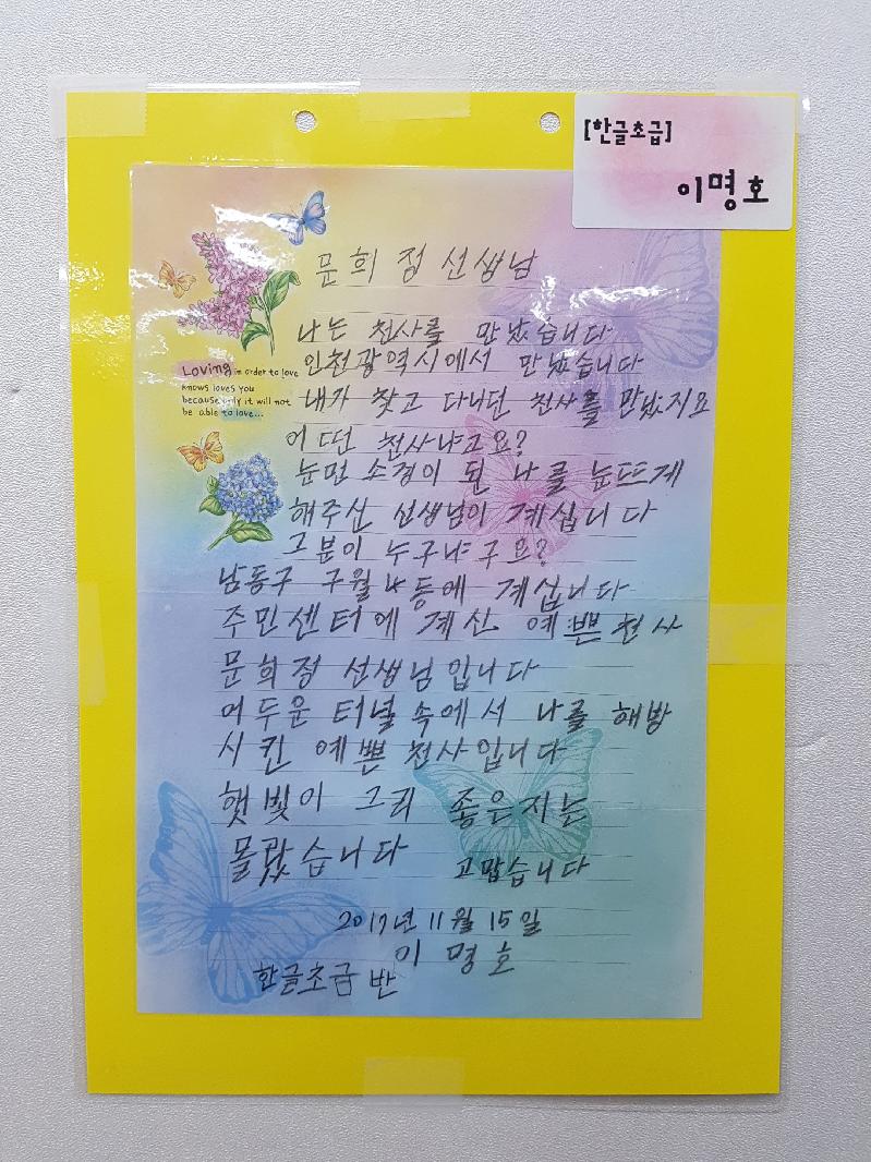 특히, 문 사례관리사의 도움으로 한글초급반에 등록해 평생동안 갈망해 온 한글을 익히고 깨우쳐 감사의 편지를 직접 작성할 수 있게 됨이 더욱 감격스럽다고 했다.