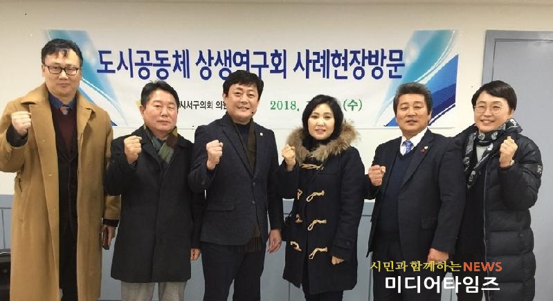 [미디어타임즈=홍기연 기자] 서구의회 의원연구단체 『도시공동체 상생연구회(회장 천성주)』는 지난 1월 10일 관내 원도심 재생사업 현장을 직접 확인하기 위하여 천마산거북이마을 커뮤니티센터와 서구상생마을 도시재생 현장지원센터를 각각 현장방문 했다. 이 날 도시공동체 상생연구회 위원들은 2015년 천마산 거북이마을 저층주거지 관리사업이 준공된 이후 개선된 사항을 둘러보고, 주민들이 체감하는 변화를 알아보기 위하여 30여명의 주민들과의 간담회를 가졌으며, 주민이 겪었던 불편사항이 개선되었는지도 꼼꼼히 챙겼다. 회장 천성주의원은 “도시재생사업이 성공적으로 진행되기 위해서는 무엇보다 주민 의견을 최대한 수렴해 반영하는 것이 중요하다”며 서구 도시재생사업을 도시재생 성공모델로 만들어 갈 것“이라고 말했다. 아울러 서구상생마을 도시재생 현장지원센터를 방문하여 서구청 도시재생팀장으로부터 현재 진행상황과 앞으로의 계획을 보고 받고 관계자들과 간담회를 가졌으며, 센터운영 및 프로그램 운영에 대한 적극적인 지원을 약속했다.