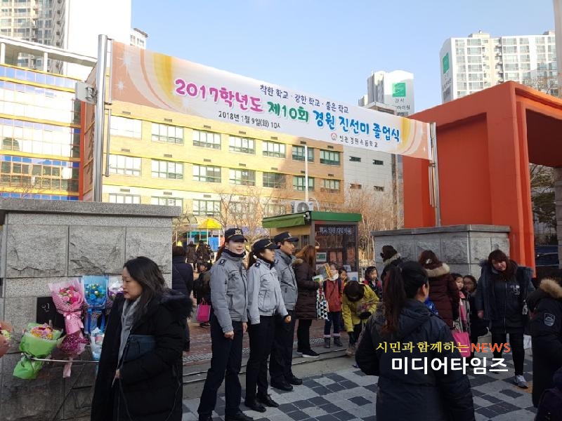 [미디어타임즈=문상수 기자] 인천남부경찰서(서장 김상철)는 지난 9일과 11일 졸업식을 맞는 경원초등학교와 전자마이스터고를 찾아 건전한 졸업식 문화 조성을 위한 캠페인을 실시했다.졸업식 전·후의 강압적 뒤풀이 문화는 대부분 사라졌으나, 은밀하게 진행될 우려를 감안해 남부서는 올해도 학교전담경찰관 중심의 면밀한 예방 순찰활동을 펼치기로 했다.졸업식 후 석별의 정을 나누는 학생·학부모를 대상으로 뒤풀이 행사가 강압적이고 폭력적인 졸업식으로 변질되지 않고 유종의 미를 거둘 수 있도록 동참 해줄 것을 홍보하며 일대 예방 순찰을 실시했다.이와 관련, 김상철 서장은 “2월 중순까지 관내 50여개 초·중·고등학교 졸업식이 순차적으로 예정되어 있는데 학교전담경찰관을 비롯한 현장경찰관들은 안전하고 강압적인 졸업식이 되지 않도록 많은 노력을 해줄 것”을 당부했다.한편, 남부서는 2월말 졸업기간 내에 관내 번화가 일대를 찾아 졸업식 뒤풀이 행사시 음주로 인한 우발사태와 졸업을 가장한 청소년들의 유흥주점 출입을 예방하기 위해 순찰활동을 강화 할 방침이다.