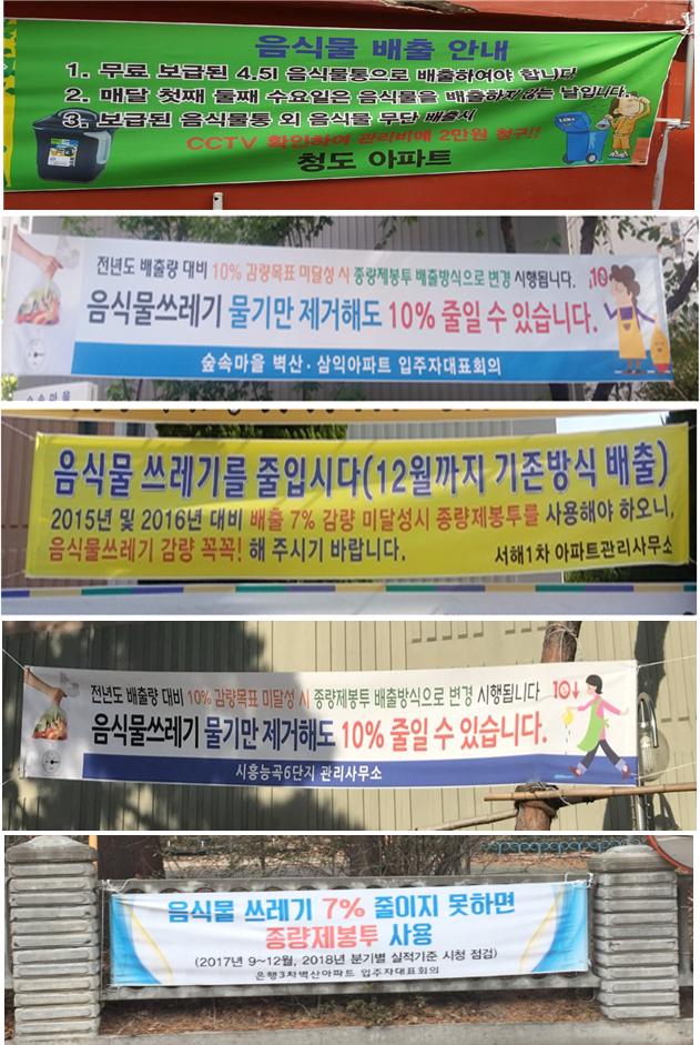 대부분의 단지에서 자체적으로 감량홍보 현수막·안내문을 제작 했으며, 감량률 1위 아파트에서는 음식물쓰레기 없는 날 운영, 물기차단용기 세대별 지급 등의 노력으로 50%가 넘는 감량률을 달성했다. 무단투기가 많이 일어났던 신천동의 한 아파트에서는 배출시간을 7시~10시로 정해 관리인 확인 하에 분리배출을 철저히 할 수 있게 노력했다.