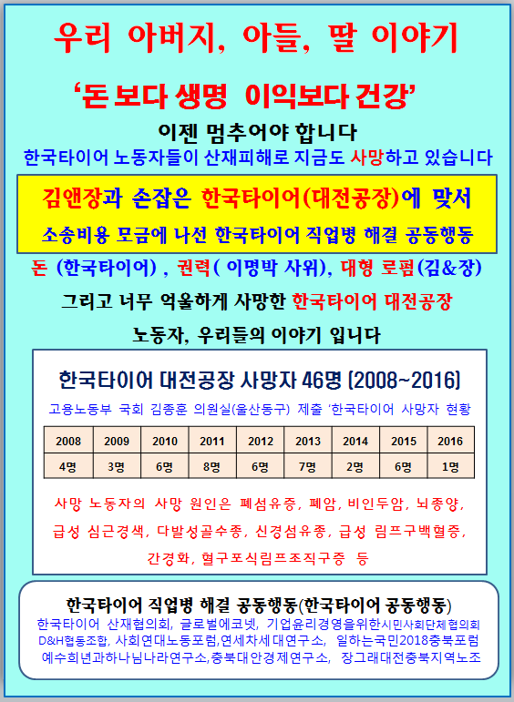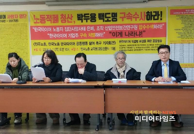 [미디어타임즈=문상수 기자] 한국타이어 직업병해결 공동행동(이하 한국타이어 공동행동)은 지난 11일 오전10시서울 광화문 경향신문 본사 15층 민주노총 교육원에서 한국타이어산재협의회, 글로벌에코넷, 기업윤리경영을 위한 시민사회단체협의회, D&H 협동조합,사회연대노동포럼,아산시민연대,연세차세대연구소,예수희년과 하나님나라연구소,일하는 국민2018충북포럼,장그래대전충북지역노동조합,충북대안경제연구소가 기자회견을 갖고 '민주노총의 한국타이어 공동행동 동참'을 촉구했다.기자회견에서 민주노총 신임 지도부에게 노동계에서 오랫동안 해결되지 못하고 심각한 문제가 제기 되어온 한국타이어 노동자 집단사망 사태에 대해 민주노총 강령과 규약의 정신에 따라 300만 중화학공업 종사 노동자들“건강권” “생명권” 지표사업장인 한국타이어 집단사망 사태해결을 위해 함께 힘을 모아 참여를 촉구했다. 고용노동부가 지난해 국회 무소속 김종훈 의원(울산 동구)에게 제출한‘한국타이어 사망자 현황(08~16.1월)’ 자료에 따르면 지난 2008년부터 2016년 1월까지 노동자 총 사망자는 46명에 달한다.2008년 4명을 비롯해 ▲2009년 6명 ▲2010년 6명 ▲2011년 8명 ▲2012년 6명 ▲2013년 7명 ▲2014년 2명 ▲2015년 6명 ▲2016년 1명 등이다.한 기업체에서 매년 한해도 빠짐없이 이처럼 많은 노동자가 사망한다는 사실은 믿기지 않는 일이다.이들 사망 노동자의 사망 원인은 폐섬유증, 폐암, 비인두암, 뇌종양, 급성 심근경색, 다발성골수종, 신경섬유종, 급성 림프구백혈증, 간경화, 혈구포식림프조직구증 등 다양하다.이에 한국타이어공동행동은 지난11월1일 한국타이어 사업주 조양래, 조현범, 서승화, 박두용,백도명, 오복수(대전지방노동청장)을 살인죄와 산업안전보건법 위반 혐의로 공동 고발했다.한국타이어의 조현범 사장은 이명박 전 대통령의 셋째 딸인 이수연씨와 지난 2001년 결혼했다.이에 따른 산재소송도 이어지고 있고, 1심 판결은 지난 2017년 8월 10일 서울중앙지법 민사63단독 정재욱 판사는 한국타이어가 유해 물질에 중독돼 암에 걸려 숨진 직원 유족에게 1억287만여원을 배상판결을 했다. 한국타이어 공장에서 근무하다 폐암이 발병해 사망한 안모씨의 유족이 한국타이어를 상대로 낸 손해배상 청구 소송에서 원고 일부 승소로 판결했다. 정 판사는 안씨가 업무상 재해로 숨졌다고 판단해 한국타이어가 안씨 아내에게 1466만여원을,자녀 3명에게는 각각 2940만여원을 지급할 것을 판결했다.정 판사는 “배기·냉각 설비를 제대로 갖추지 않은 채 근로자들에게 마스크를 착용하고 작업 할 것을 독려하고 감독한 것만으로는 안전 배려 의무를 다했다고 볼 수 없다”며“안씨는 비흡연자이고 병력이나 가족력 등 이 사건 질병이 다른 원인으로 발생했다고 볼 만한 사정을 찾기 어렵다”고 밝혔다. 다만 “안씨를 비롯한 근로자들이 마스크를 하지 않은 채 작업하기도 한 것으로 보이는 점 등 을 감암하면 피고의 책임 비율을 50%로 제한함이 타당하다”고 판시했다.한국타이어는 불복, 항소했다. 한국타이어는 국내 최대 로펌인 김앤장을 소송대리인으로 선임하면서 다윗과 골리앗의 싸움이 시작되었고, 이에 맞서 시민사회단체, 노동계, 종교계까지 동참 한국타이어 노동자 집단사망과 관련, 법정 싸움을 펼치고 있는 한국타이어산재협의회와 이들의 소송비용 마련을 위해 공개모금을 시작했고, 공개모금은 크라우드 펀딩과 자체 공개모금을 전개하기로 했다. 모금 계좌번호는 하나은행 656-910015-78104 디앤에이치협동조합(D&H)이다.
