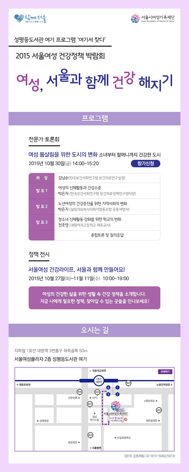 - 토론회 : ‘여성, 서울과 함께 건강해지기’ (10월 30일 14:00 ~15:20)