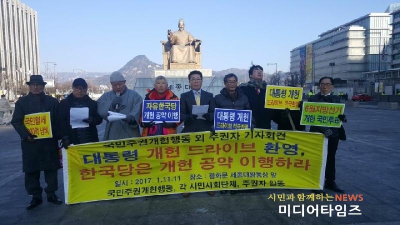 [미디어타임즈=문상수 기자] 오늘(1월 11일, 목요일) 오전 11시 광화문 세종대왕 동상 앞에서 시민사회활동가와 국민주권운동가 15인이 강추위 혹한의 날씨에도 불구하고 “문재인 대통령의 개헌 드라이브를 환영한다. 자유한국당 등 원내 5개 정당은 개헌공약 이행하라!”고 촉구하는 기자회견을 개최했다. 개혁연대 민생행동 대표이자 국민주권 개헌행동 공동대표인 송운학은 한국외국어 대학교 법학전문대학원 이장희 명예교수 등 불가피한 사정으로 오늘 기자회견에 동참하지 못한 나머지 다수의 공동대표들과 공유하고 있는 내용이라면서‘여는 말씀’을 시작했다. 송운학공동대표는“국민주권 개헌행동은 문대통령이 제시한 개헌방안에 대한 두 가지 비판이 제기되고 있다는 것을 잘 알고 있다. 하나는 제왕적 대통령제가 초래하는 폐해를 극복하기 위한 진지한 고민이 결여되어 있다는 것이다. 또 다른 하나는 제왕적 권력구조 개선대책에 대한 합의 없이 2단계 개헌을 추진할 경우, 국회통과가 불가능하다는 것이다. 이들 비판은 일면 타당하다. 하지만, 문대통령이 여러 가지 가능성을 열어놓고 있다는 점에서 완전하게 정당한 것은 아니다. 예컨대, 문대통령이 희망하는 대로 국민이 참여하여 직접 결정하는 방식으로 개헌안을 마련한다면, 이 과정에서 이들 흠결은 극복 가능하기 때문이다. 촛불정신으로 무장된 주권자 다수는 이들 문제에 대한 대책을 제시하는 정당 또는 정치인이라면,그 당이 여당이건 야당이건 그리고 또 그 사람이 국회의원이건 대통령이건 전폭적으로 지지할 것이다.”라고 주장했다.김선홍 공선협 상임공동대표는 경과보고에서 “지난 1월 8일 월요일 국회 정문 앞에서 개최된 57개 조직 대표와 개인자격 동참 일반 주권자께서 이미 대통령 등을 면담하여 6월 개헌이 반드시 이루어지도록 노력해 달라는 국민요구를 전달하기로 결정했다. 서둘러 오늘 기자회견을 하게 된 이유는 대통령이 개헌방안과 일정을 밝혔기 때문이다. 이에 지난 해 대선시기 원내 5개 정당과 공천후보가 밝힌 개헌공약을 이행하라고 요구하는 기자회견을 하게 되었다. 하지만, 이는 앞으로 6월 개헌을 반드시 달성하기 위한 첫 걸음에 불과하다. 그 어떤 어려움이 나타나도 우리 발걸음을 멈출 수 없을 것이다”고 다짐했다. 참가자들은 기자회견문을 통해 문대통령이 개헌방안과 일정 등을 제시한 것을 크게 환영하면서도“국민개헌을 하겠다고 강조했을 뿐 구체적인 세부방안을 제시하지 않아 아쉬움이 남는다.”며 주장했다. 또, 문대통령이 조속한 시일 내에 그 구체적인 방안을 밝힐 것이라는 기대감을 나타냈다. 이들은 또,“국회합의는 기본적으로 독립적인 헌법기관인 국회의원이 각각 책임져야 마땅하다.”고 주장했다. 이는 주권자가 바라는 것은 국회와 대통령을 각각 독자적인 민의수렴을 거쳐 서로 경합하고 보완할 수 있는 개헌안을 제시하는 것”이기 때문이라는 것이었다. 즉, 두 경로(two track) 개헌을 지지하면서도 대통령은 국회를, 또 국회는 대통령을 지나치게 의식하지 말라는 주문을 에둘러 표시한 것이다. 또, 이들은 “이 과정에서 민심이 원한다면, 서로 협상하고 타협하고 합의하는 것이 바람직하다”고 주장했다. 특히, 이들은 대통령이 “정부형태에 관한 자신의 소신을 고집하지 않겠다.”고 약속했으므로“이제 남은 문제는 5개 원내정당이다.”라고 주장했다. 즉, 지난 대선 시절 모든 후보가 ‘6월 지방주민자치선거’와 ‘개헌국민투표’를 동시 실시하겠다는 국민과의 약속을 지키라고 요구했다. 이를 위해 이들은 “5개 정당 대표 또는 원내대표와 공개면담을 제안”했고, “다른 방식을 통해서라도 이들 문제에 대한 각 정당의 입장”을 듣겠다고 선언했다. 또, 끝내 6월 개헌이 이루어지지 않는다면, 이를 불가능하게 만든“국회의원 퇴출운동 또는 낙선운동을 힘차게 전개할 것”이라고 선언했다. 특히,“자유한국당을 비롯한 5개 원내정당은 법제상 수명을 보호받고 있을 뿐 민심을 제대로 반영하지 못하고 있다. 이번 6월 실시되는 지방주민선거는 자치정부 차원에서 명백한 사망선고를 내릴 것”이라고 주장했다. 이들은 지난 월요일 (1월 9일) 국회정문 앞에서‘국민주권개헌행동’가입 25개 시민사회단체와 우리헌법읽기국민운동’을 비롯한 전국 30여개의 시민사회단체 및 2개 원외정당(사회민주당 비상대책위와 늘푸른한국당) 그리고 이를 지지하는 일반 주권자 최소 약 850여명에 속하는 송운학(개혁연대 민생행동 대표), 김선홍(공선협 상임공동대표), 이보영(기업윤리경영을 위한 시민사회단체협의회 공동대표), 문무우(구리민주시민공동체 대표), 김두루한(참배움연구소장), 김용철(춘천중도선사유적지보존 국민운동본부 대외협력이사), 박창규(전 전교조 경기지부장),전재진(우키시마호 폭침진상규명회 회장), 정광미(9.11개헌일꾼 8.15선발대원)은 물론 개인 자격으로 새롭게 합류한 명진 스님(관음종 수행처 본원사 주지, 불교종단협의회 인권의원), 박윤재(새로운 100년을 여는 통일의병), 송환웅(사단법인 참교육을 위한 전국학부모회 대외협력국장), 이교영(주