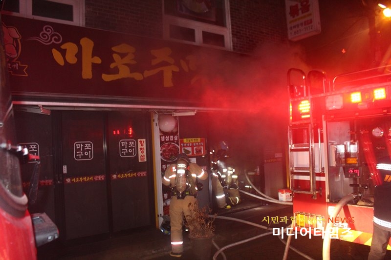 | 도화동 식당 화재 진압현장 사진. <ⓒ미디어타임즈> |