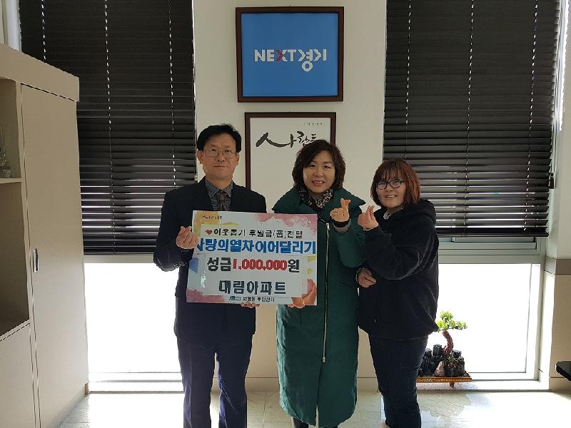 [미디어타임즈= 이옥수 기자] 용인시 기흥구 보정동은 관내 대림아파트 주민들이 지난 12일 연말연시 이웃돕기 운동인 ‘사랑의 열차 이어달리기’에 성금 100만원을 기탁했다고 밝혔다.