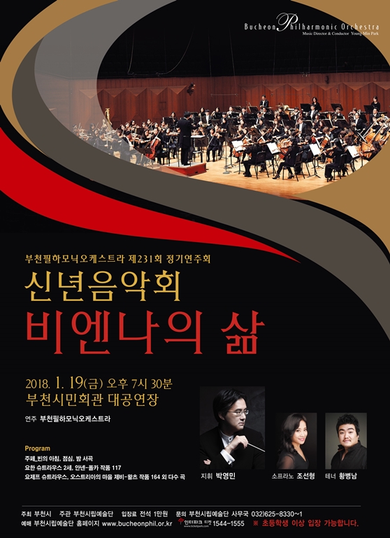 신년음악회 ‘비엔나의 삶’은 문화예술의 도시 오스트리아 비엔나의 향기를 문화특별시 부천에서 마음껏 즐겨 볼 수 있을 것이다. 전석 1만원. 초등학생 이상 입장. (예매 부천시립예술단 홈페이지 www.bucheonphil.or.kr)