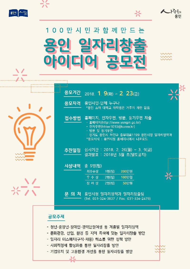 [미디어타임즈= 이옥수 기자] 용인시는 다음달 23일까지 지역 실정에 맞는 참신한 일자리 정책을 발굴하기 위해 시민들을 대상으로‘일자리창출 아이디어 공모전’을 실시한다고 밝혔다. 일자리 창출과 관련한 시민들의 아이디어를 시책에 적극 반영하기 위해서다.