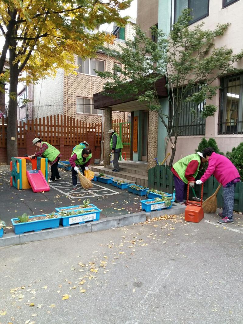 | 성남시 어르신 소일거리 사업 환경정비 분야 참여자들이 동네 낙엽을 쓸고 있다. |