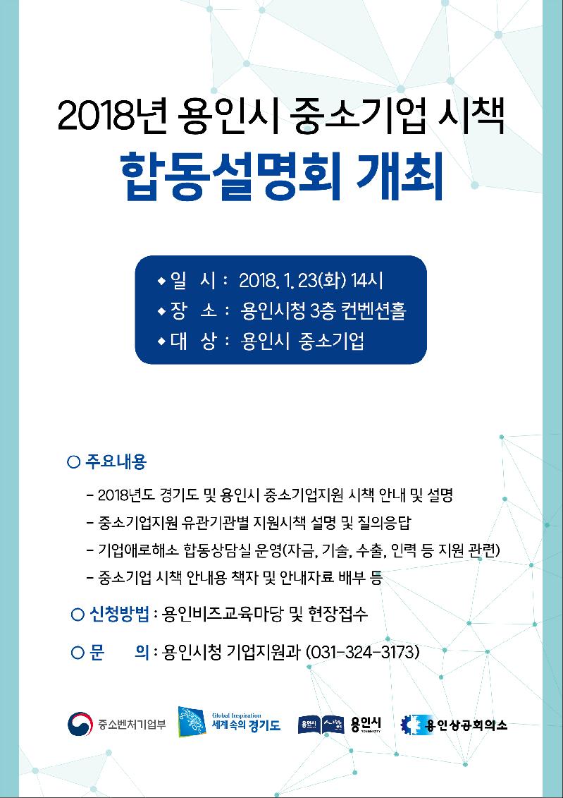 [미디어타임즈= 이옥수 기자] 용인시는 오는 23일 오후 시청 컨벤션홀에서 관내 중소기업을 대상으로 중소기업 지원시책 합동설명회를 개최한다고 밝혔다.
