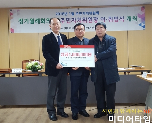 [미디어타임즈=문상수 기자] 인천광역시 계양구 계산1동 주민자치위원회(위원장 차종법 )는 지난 16일 계산1동 행정복지센터( 동장 이기운)를 방문하여 2018년 적십자 특별회비 100만 원을 기탁했다.차종법 주민자치위원장은 “적은 금액이나마 어려운 이웃들을 위해 쓰일 수 있다는 것에 큰 보람을 느끼며, 작은 보탬이 모여 이루어진 큰 도움이 주변의 어려운 이웃들에게 전달될 수 있도록 더 많은 주민이 적십자회비 모금에 적극적으로 참여해 주었으면 좋겠다”고 말했다.성금을 전달받은 이기운 계산1동장은 “자발적인 기부로 어려운 이웃에게 훈훈한 정을 나눌 수 있도록 적십자회비 모금에 적극 협조하여 주심에 감사드리며, 이번 전달식을 계기로 나눔 문화를 확산시켜 더 많은 이웃에게 따듯한 마음이 전해질 수 있도록 최선을 다하겠다”고 말했다.