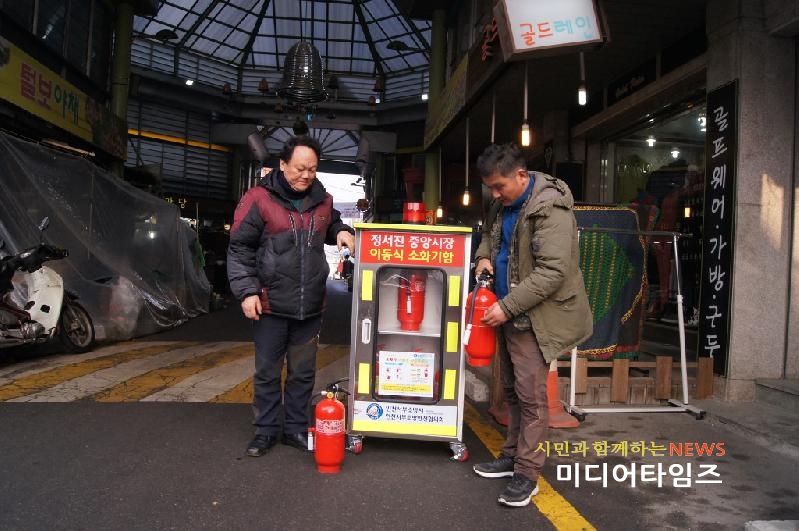 [미디어타임즈=문상수 기자] 인천서부소방서(서장 김준태)는 지난 1월 13일(토) 13시경 전통시장(정서진 중앙시장)에서 화재가 발생했으나, 시장에 설치된 이동식 소화기(함)에 있는 소화기 6개를 이용해 화재를 신속하게 진압 자체 진화되어 인근점포 등 주변으로 화재가 확대되는 것을 막아 주위에 귀감이 되었다.이날 화재는 주인이 자리를 비운사이에 김굽는 기계옆에 있는 스치로폼 박스에서 발생하였으나, 인근 야채가게 사장과 번영회장 등 자율소방대원 4명이 전통시장 내에 설치되어 있는 이동식 소화기(함)에 있는 소화기 6개를 이용해 화재를 진압하여 자체 진화되었으며, 인명 및 재산피해는 없는 것으로 알려졌다.또한, 이날 사용된 이동식 소화기(함)은 인천서부소방서에서 2017년 겨울철 특수시책 추진사항으로 전통시장 초기소화 극대화 및 화재안전관리 강화를 위해 정서진 중앙시장 등 3개소에 2017년 12월에 설치했다.서부소방서 관계자는 소화기로 화재를 초기에 진압해 개인의 생명과 재산을 지킬 수 있었던 것처럼 “시장 각 점포마다 소화기를 반드시 비치할 것과 겨울철 화기 및 전기시설 취급 시 부주의 방지 등 화재예방에도 만전을 기하여 줄 것”을 당부했다.