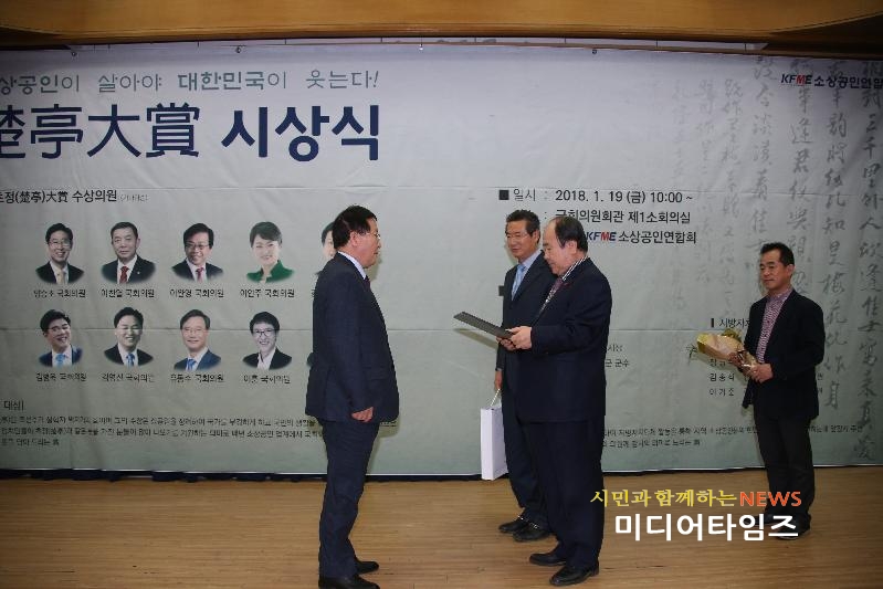 [미디어타임즈=문상수 기자] 조윤길 옹진군수는 19일 국회 의원회관 제1소회의실에서 열린 2017 초정대상 시상식에서 소상공인 선정 목민감사패를 수상했다.소상공인 선정 목민감사패는 지자체내 소상공인들의 권익보호와 경쟁력제고를 위한 적극적인 지원에 감사하며, 앞으로 지역소상공인연합회와의 활발한 교류를 통해 지자체내 소상공인들에 대한 지속적인 지원과 관심을 요청하기 위한 상으로 2018년 처음으로 신설되었다.소상공인연합회는 지난 9일 외부 심사위원으로 구성된 ‘초정대상 심사위원회’를 열고 그동안 추진한 여러분야의 소상공인 지원대책에 대한 다각면의 심사를 진행하여 목민감사패 수상 지방자치단체장으로 조윤길 옹진군수를 최종 선정했다. 옹진군은 7개면 100여개의 섬으로 이루어져 높은 해상운송비, 원재료비 등으로 소상공인들이 영업하기에 최악의 조건이나, 운반비(생필품, 연료 등) 지원과 소상공인 특례보증, 간판 정비사업, 저온저장고·포장용기 지원 사업, 마을기업 육성 등 소상공인 지원에 군의 모든 역량을 동원하였으며 이 공로를 인정받아 이번 목민감사패를 수상하게 되었다. 조윤길 옹진군수 “이번 목민감사패 수상을 계기로 다산 정약용 선생님의 위대한 저서인 목민심서를 다시 한 번 상기하게 되었으며, ‘목민’의 의미를 되새겨 소상공인의 권익보호와 경쟁력제고를 위해 최선의 노력을 다할 것을 약속한다.”고 말했다.