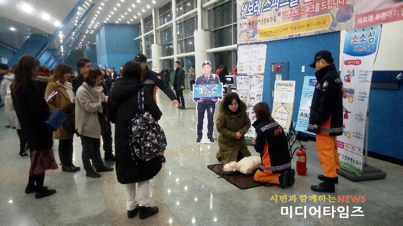 [미디어타임즈=문상수 기자] 인천부평소방서(서장 정병권)는 지난20일 부평구 삼산동 삼산월드체육관의 가수 ‘케이윌(Kwill)’공연장 앞에서 열린 안전체험부스가 시민들에게 큰 호응을 얻었다. 이 날 안전체험부스는 콘서트를 보러 온 시민들을 대상으로 화재 등 각종 안전사고 예방과 심폐소생술을 주제로 프로그램을 마련했다. 화재가 가장 많이 발생하는 계절인 겨울철을 맞아 가정 내 화재예방을 위한 소화기와 단독경보형감지기를 소개하며 시민이 직접 작동해 볼 수 있도록 체험판을 통해 관심을 불러 일으켰고, 마네킨을 눌러보며 심폐소생술을 배워보는 시간을 가졌다. 소방서 관계자는“많은 시민들이 모이는 공연장을 찾아 누구나 편하게 안전을 배워볼 수 있도록 자리를 마련해 관심을 가져주는 시민들이 많았다”며“앞으로도 더 많은 체험기회를 통해 안전한 사회 분위기 조성 에 노력하겠다”고 전했다.