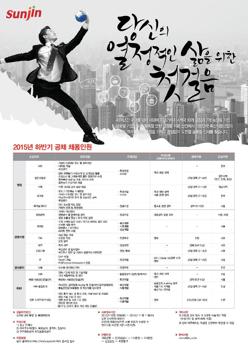 축산식품전문기업 선진(총괄사장 이범권)이 10월29일(목)부터 11월 11일(수)까지 2015년 하반기 신입 및 경력사원 공개채용을 실시한다.