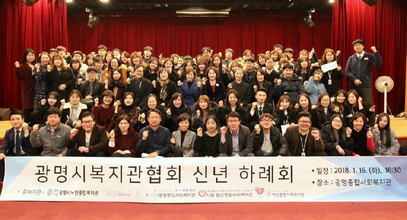 광명시 관내 5개 복지관(광명종합사회복지관, 철산종합사회복지관, 하안종합사회복지관, 광명장애인종합복지관, 광명시노인종합복지관)의 회원으로 구성된 광명시복지관협회는 기관종사자 120여 명이 모여 지난 2017년도의 사업성과를 함께 공유하고 2018년 새해 사업운영 방향을 제시하며 기관간의 우호를 다지며 종사자 역량강화를 위한 프로그램을 진행하였다