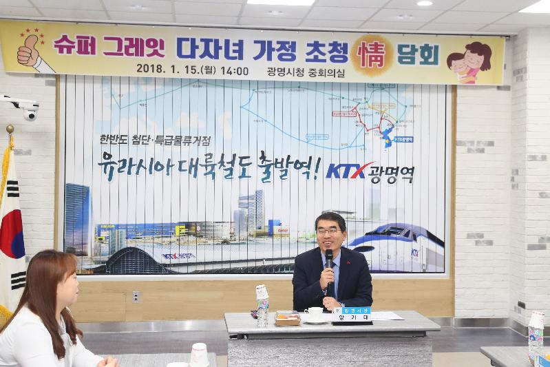 양기대 광명시장은 15일 시청 중회의실에서 시에 거주하는 슈퍼 그레잇 다자녀 5가정을 초청해 간담회를 가졌다.
