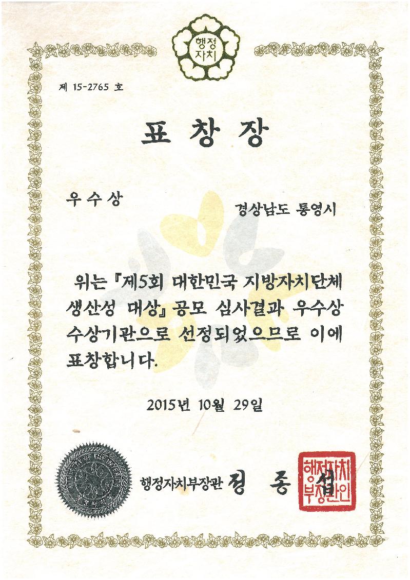 통영시(시장 김동진)가 지난 29일(목) 오후 3시, 세종컨벤션센터 국제회의장에서 개최된 "제5회 대한민국 지방자치단체 생산성 대상"에서 영예의 우수상을 수상했다.