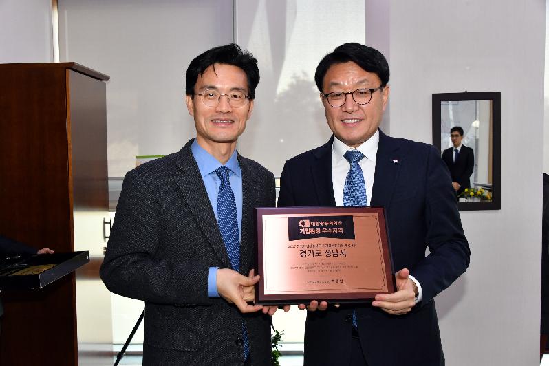 대한상공회의소 측은 1월 19일 오전 11시 성남시청 2층 부시장실을 방문해 이재철 부시장에게 기업환경 우수지역 인증서(경제활동친화성 개선 1위)를 전달했다.