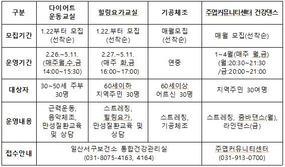 이외에도 주엽역 커뮤니티센터와 연계한 ‘건강댄스프로그램’이 오는 4월까지 운영되며 지역주민이 부담 없이 운동할 수 있는 ‘야간운동교실’을 오는 5월부터 10월까지 일산역기찻길공원 및 주엽문화공원에서 만나 볼 수 있다.