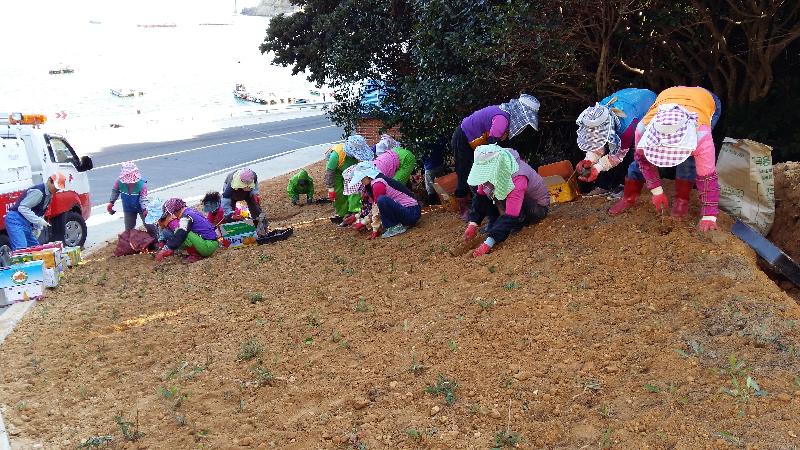 이번 사업은 보조금 3백만원과 자부담 50만원으로 추진하였으며, 마을주민 20여명이 참여해 도로변 고사목 제거, 동백나무 가지 치기등 주변정비와 백접 4,300주를 식재했다.