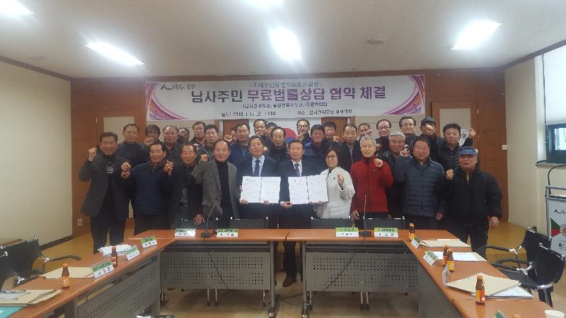 [미디어타임즈= 이옥수 기자] 용인시 처인구 남사면은 ‘면민 모두가 행복한 남사’를 만들기 위해 최근 법무법인 동천과 저소득층을 위한 무료법률상담 협약을 체결했다고 22일 밝혔다.