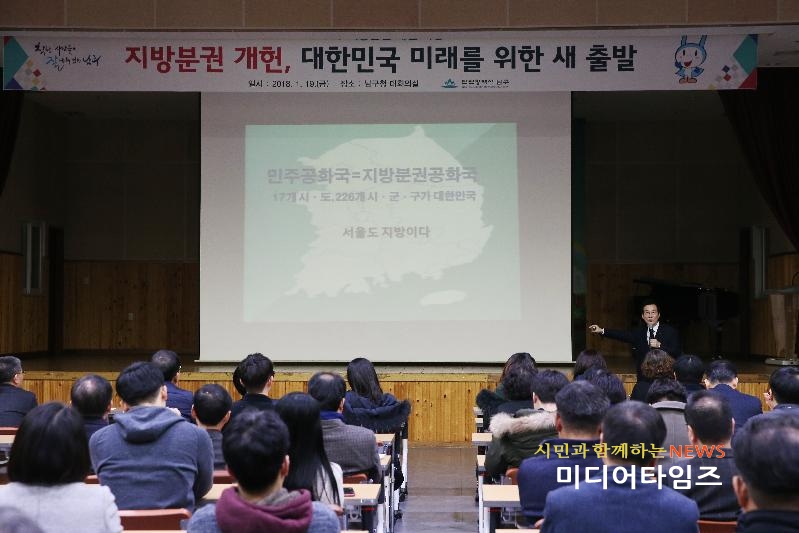 [미디어타임즈=문상수 기자] 인천 남구는 지난 19일 구청 대회의실에서 전 직원을 대상으로 지방분권 강연회를 개최했다.강연회는 김중석 지방분권개헌국민회의 공동대표가 강사로 나서 ‘지방분권 개헌, 대한민국의 미래를 여는 새출발’이라는 주제로 지방분권 개헌의 필요성, 다른 국가의 지방분권 사례, 지방분권 개헌의 과제 등을 소개했다.김 강사는 “지방분권 개헌의 주인공은 지역 주민들”이라며 “주민의 눈높이에 맞춰 함께 고민하고 공감대를 형성, 협력적 관계에서 지방분권 개헌을 추진해 나갈 때 비로소 실질적인 지방자치가 실현될 수 있다”고 강조했다.박우섭 남구청장은 “이번 강의는 주민들의 삶을 바꾸는 지방분권 개헌을 앞두고 이를 대비하기 위해 공직사회의 자치역량을 강화하고 지방분권에 대한 이해의 폭을 넓히는 좋은 계기가 됐다”고 말했다.한편 이번 강연회는 개헌 논의를 앞두고 있는 문재인 정부의 지방분권정책에 대한 공감대 확산을 위해 실시됐다.앞서 남구는 지난해 8~9월 자치분권대학 남구 캠퍼스를 운영, 주민과 공무원 등 50여명을 대상으로 자치분권 교육을 실시한 바 있다.