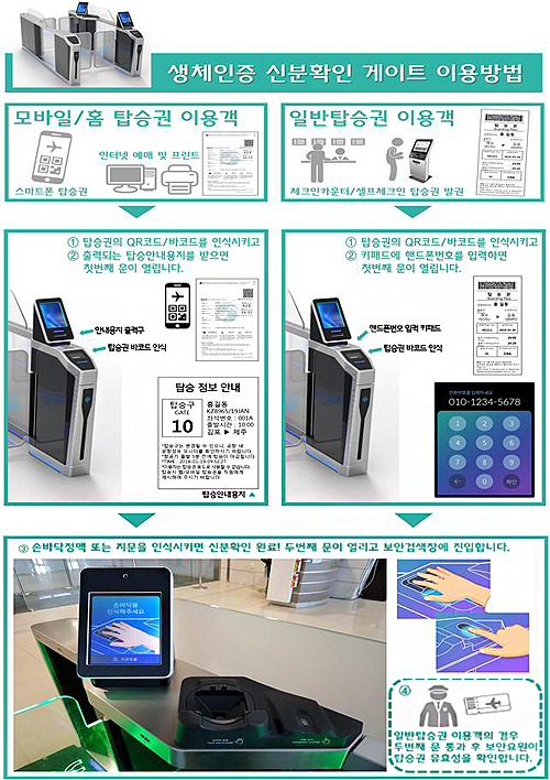 국토부 관계자는 “생체정보를 이용한 탑승수속은 여객편의 및 혼잡해소 효과를 높이기 위해 여객이 많은 김포, 제주공항에 우선 도입하고 올해 안으로 김해, 대구, 청주 등 타 공항으로 확대해 나갈 계획”이라고 밝혔다.