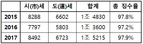 2016년 1조 3600억 원이었던 지방세 징수액은 1년 만에 1615억 원(11.87%) 늘어났다. 2015년 지방세 징수액은 1조 4830억 원이었다.