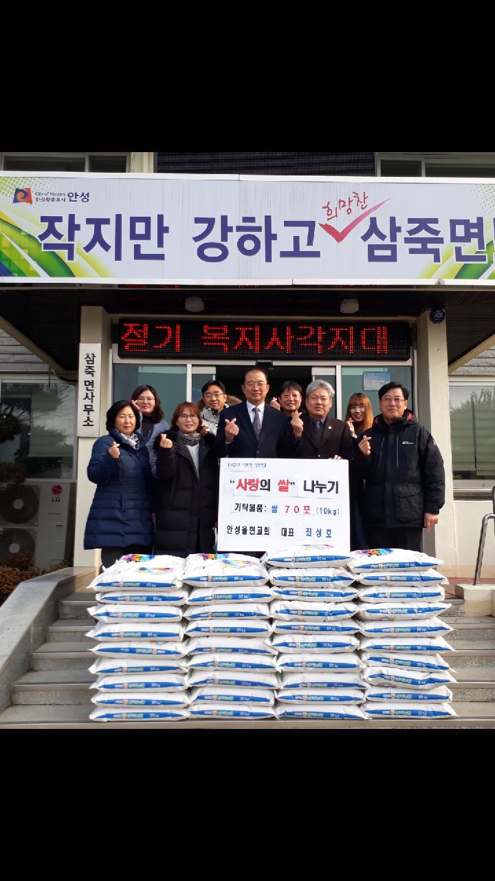 [미디어타임즈= 이옥수 기자] 안성시 삼죽면에 있는 안성율현교회(대표 최상호)는 2018년 1월 22일 삼죽면 관내 어려운 주민들을 위해 전달해 달라며 쌀(10kg) 70포를 기탁했다.
