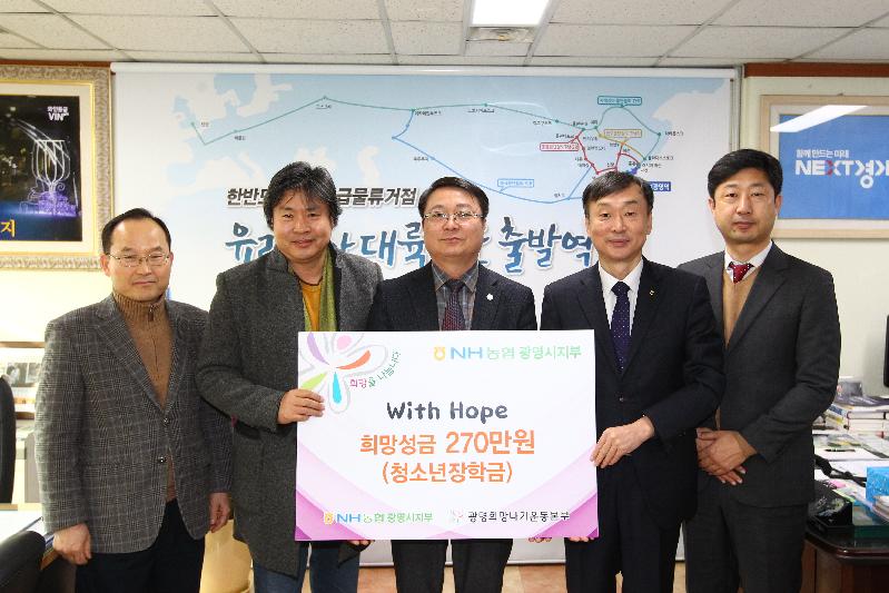 [미디어타임즈= 신훈종 기자] 광명시사회복지협의회-광명희망나기운동본부(회장 서일동)는 NH농협 광명시지부(지부장 한재봉)로부터 청소년장학금 270만원을 전달받았다.