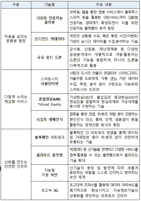 10대 유망기술은 “마음을 살피는 맞춤형 행정”, “다함께 누리는 체감형 서비스”, “신뢰를 만드는 안전한 인프라(기반)”를 구현하고, 기술과 서비스 간 융합과 상호작용을 통해 국민을 우선하는 ‘사람 중심’의 전자정부를 제공할 예정이다.