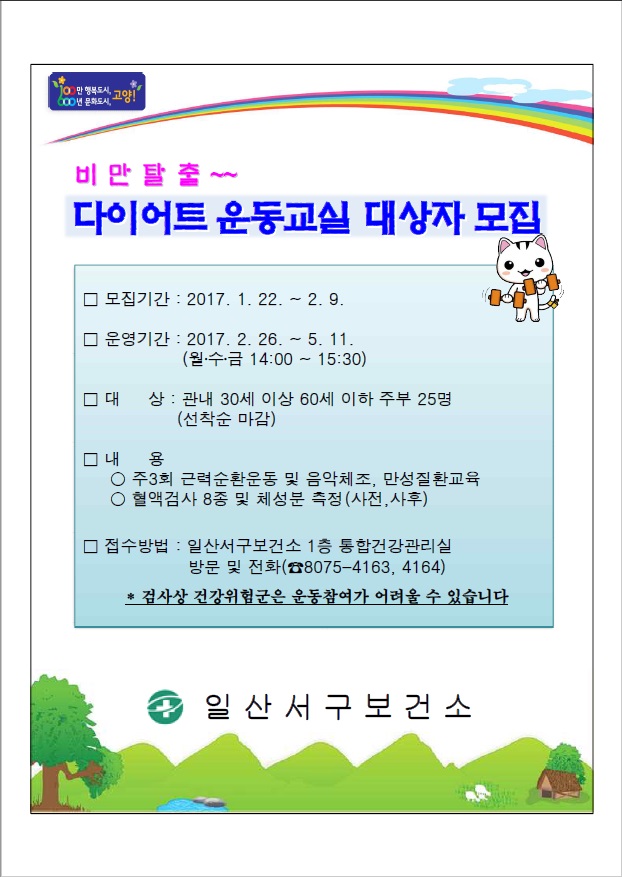 ‘다이어트 운동교실’ 및 ‘건강힐링 요가교실’은 오는 2월 9일까지 모집하며 선착순으로 참여할 수 있다. 문의사항은 일산서구보건소 통합건강실(☎031-8075-4163, 4164)로 하면 된다.