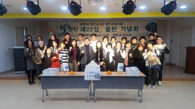 23일 하안도서관 4층에서 열린 빛누리독서회(회장 김춘년)「빛누리 22집」출판기념회에서는 설진충 평생교육사업소장을 비롯한 회원 및 지역문화계 인사 등 40여 명이 참여한 가운데 그동안 발행된 문집 전시를 비롯하여 2017년 활동 영상 감상, 내빈축사, 시낭송, 독창 등이 진행됐다.