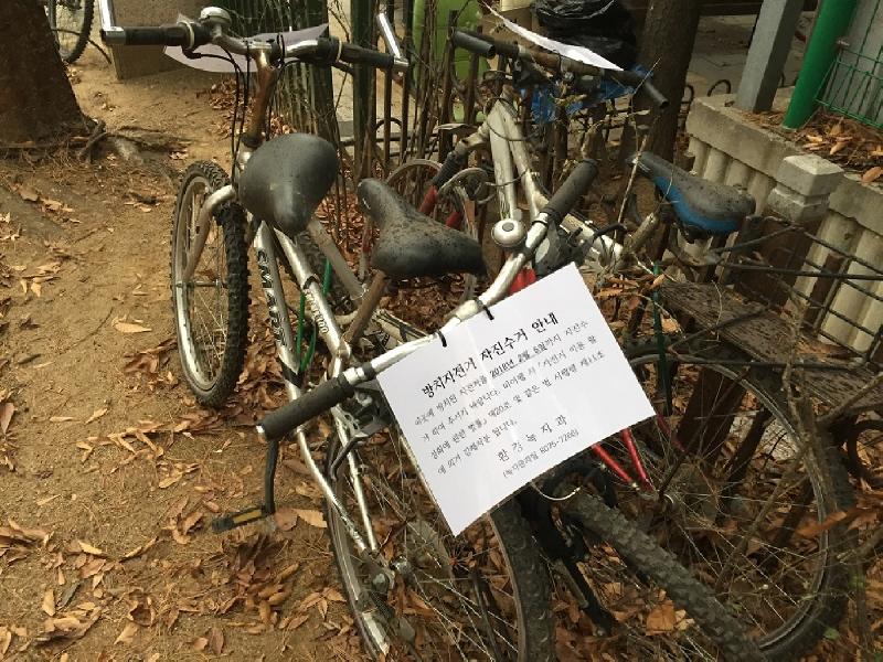 대표적인 사례가 오마중학교 뒤편에 위치한 오마어린이공원으로 자전거 6대가 방치돼 있어 구는 지난 23일 폐자전거 정비에 나섰다. 방치된 자전거에 자진수거 안내문을 부착해 오는 2월 6일까지 자발적으로 수거하도록 했다. 만약 기한까지 수거하지 않을 경우 강제 처분될 예정이다. 이어 다른 공원에 대해서도 일제조사를 실시해 방치자전거를 수거하고 자전거 관리부서와 공조해 대책을 강구할 방침이다.