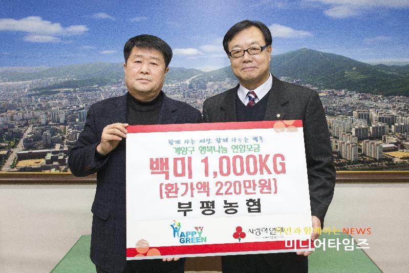 [미디어타임즈=문상수 기자] 인천 부평농협(조합장 이상원)은 지난 24일 ‘희망2018 따뜻한사랑나누기 캠페인’ 에 동참해 백미 1,000kg(환가액 220만 원)을 계양구청에 기탁했다.2013년부터 매년 백미 기탁을 이어오고 있는 부평농협은 나눔활동 실천 우수기관으로써, 지역사회 어려운 이웃들에게 든든한 버팀목이 되고 있다.기탁식에 참석한 이상원 조합장은 “작은 정성을 모아 마련한 백미가 어려운 이웃들의 따뜻한 한 끼가 되길 바란다”며 “앞으로도 지역주민들에게 더욱 도움이 될 수 있도록 노력해 나가겠다”고 말했다.한편, 계양구는 인천사회복지공동모금회와 공동으로 ‘희망2018 따뜻한사랑나누기 캠페인’을 오는 2월 말까지 진행 중이며, 기부된 성품은 관내 저소득가정에 전달될 예정이다.